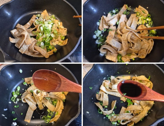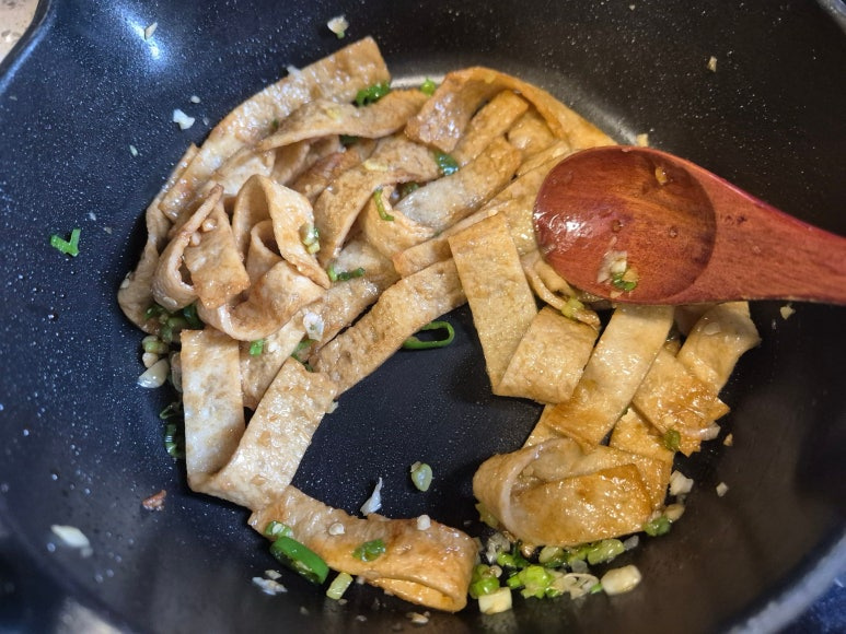 이어서 다진 마늘을 넣고 송송 썬 대파와 청양고추를 넣어 볶아주세요 마지막 물엿 2스푼을 넣고 볶다가 양조간장 1스푼을 넣어 볶아요 저는 어묵 양을 반으로 줄여서 물엿 1스푼에 간장 반 스푼으로 간을 했어요