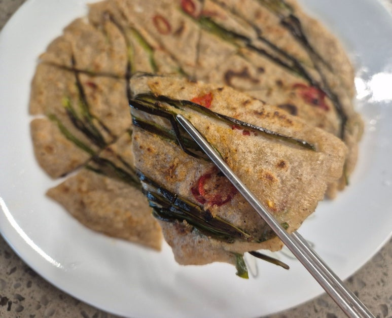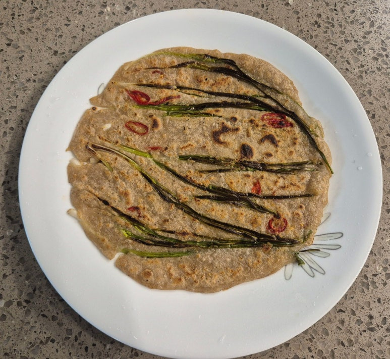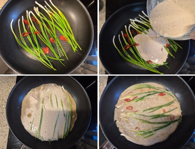 달군 팬에 식용유 1스푼을 넣고 불 조절을 약불로 해 놓으세요 팬에 쪽파와 홍고추를 먼저 깔아주세요 그 위에 메밀 반죽을 골고루 부어주세요 불 조절을 약불에서 중약 불로한 후 앞뒤로 노릇하게 구워주세요