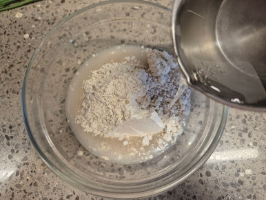 메밀가루를 볼에 담고 물은 메밀가루에 1.5배를 붓고 소금 두 꼬집 정도를 넣고 저어 주세요