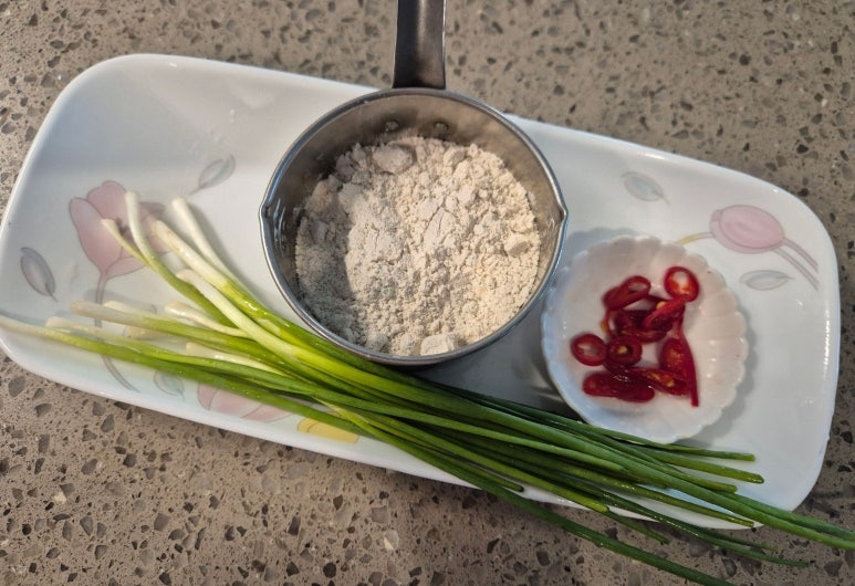 메밀가루 1/2컵(100ml) , 쪽파 20g , 홍고추 1개 , 물 150ml(1.5배)