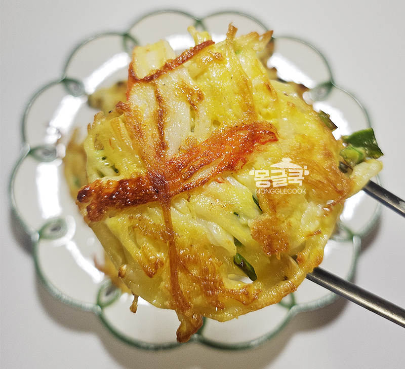 뒤집은 후에는 뒤집개로 살짝 눌러주며 약불로 줄여 속까지 익히면 완성이에요.