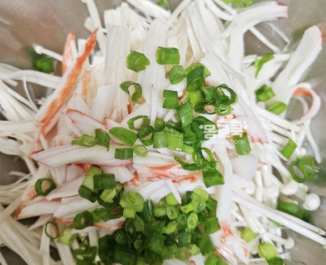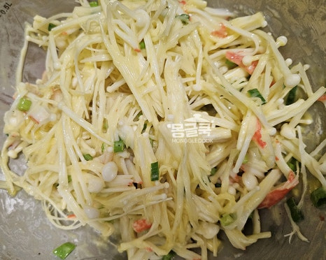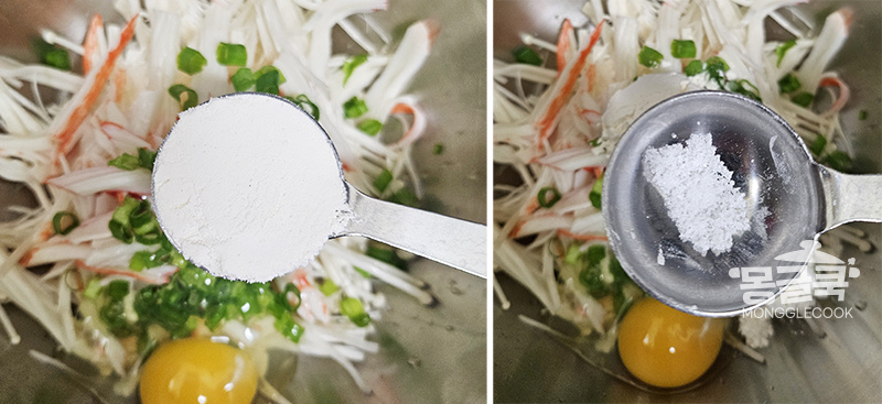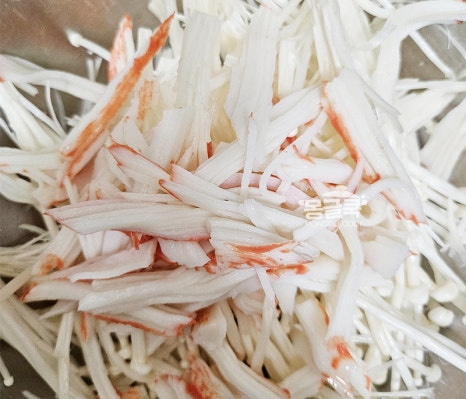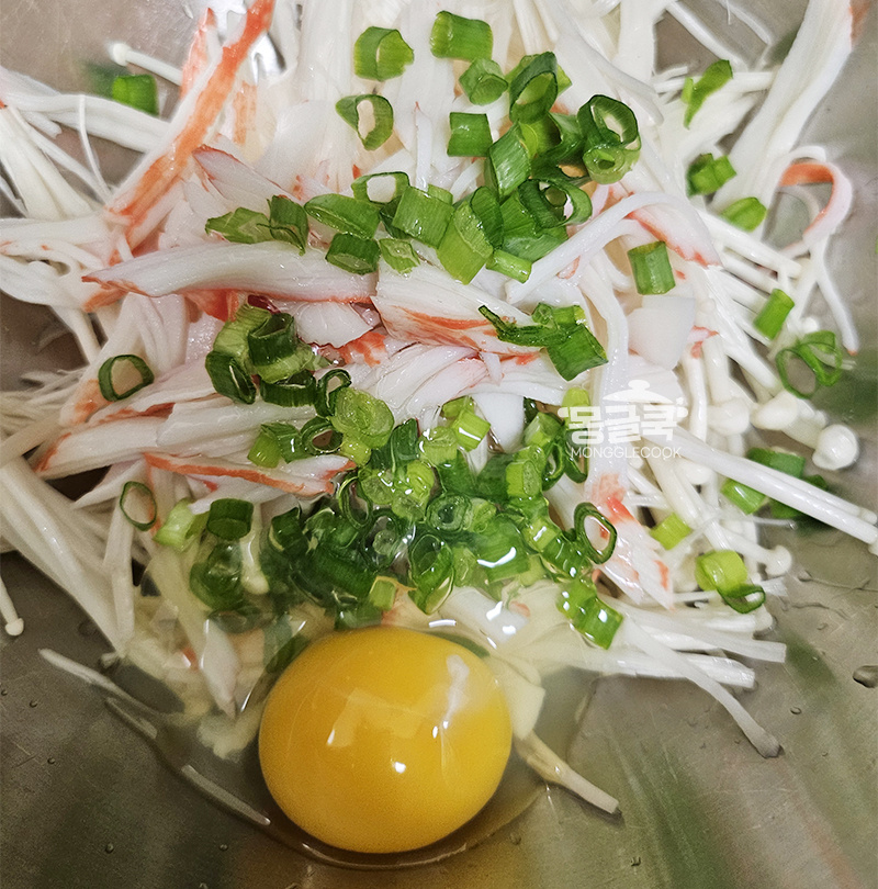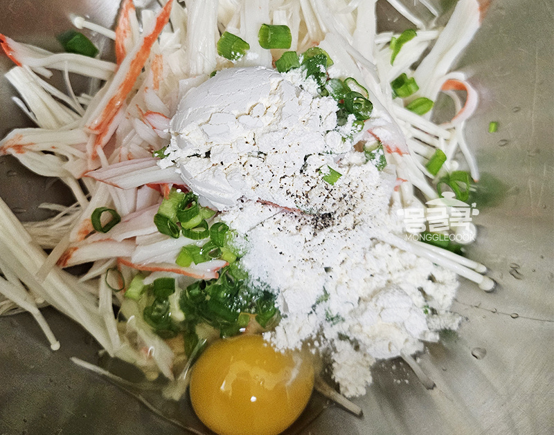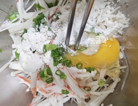 팽이버섯과 크래미에서 자연스럽게 수분이 나와 반죽이 촉촉해져요.