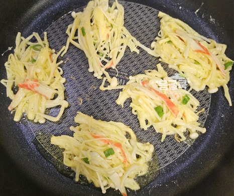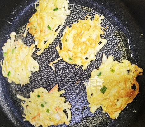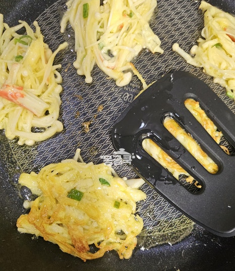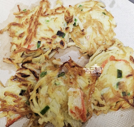 노릇하게 익은 팽이버섯 크래미전은 키친타월 위에 잠깐 올려 기름기를 빼주세요.