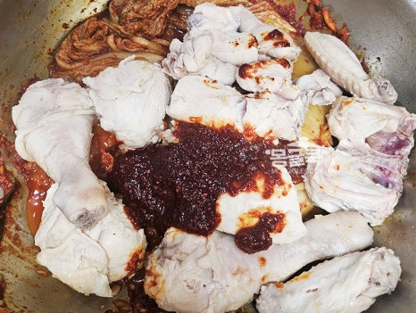 밑간해둔 닭을 넣고 남은 양념장을 모두 넣어 중불에서 5분 정도 볶아 주세요.