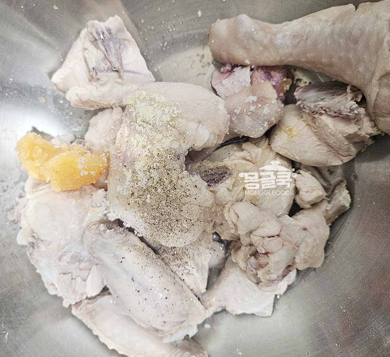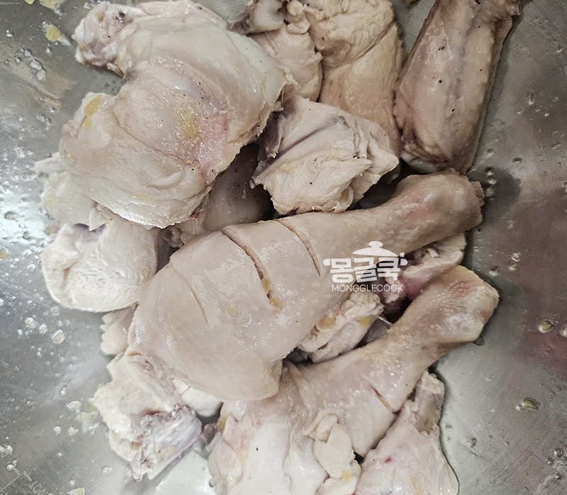 닭은 끓는 물에 1~2분 데쳐 불순물과 잡내를 제거한 뒤 깨끗이 헹궈주세요.