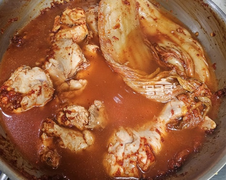 김치 속을 털어내고 묵은지만 사용하면, 국물 맛이 훨씬 깔끔하고 개운한 닭볶음탕이 완성돼요.