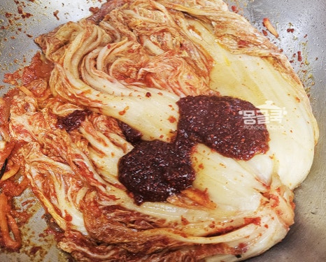 묵은지에 준비한 양념장 중 1/3 정도만 넣고 살짝 더 볶아요.