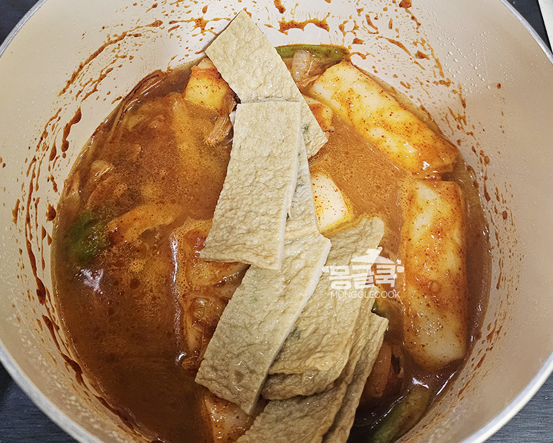 양념이 잘 섞였으면 물 150ml와 어묵을 넣고 중불로 끓여 주세요.