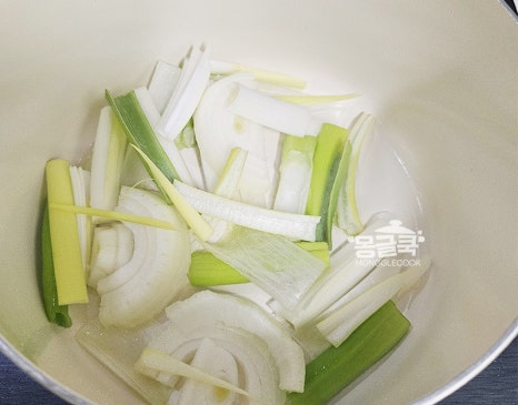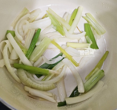 팬에 식용유 1큰술 두르고 대파와 양파를 넣어 중불에서 2~3분 정도 볶아주세요.