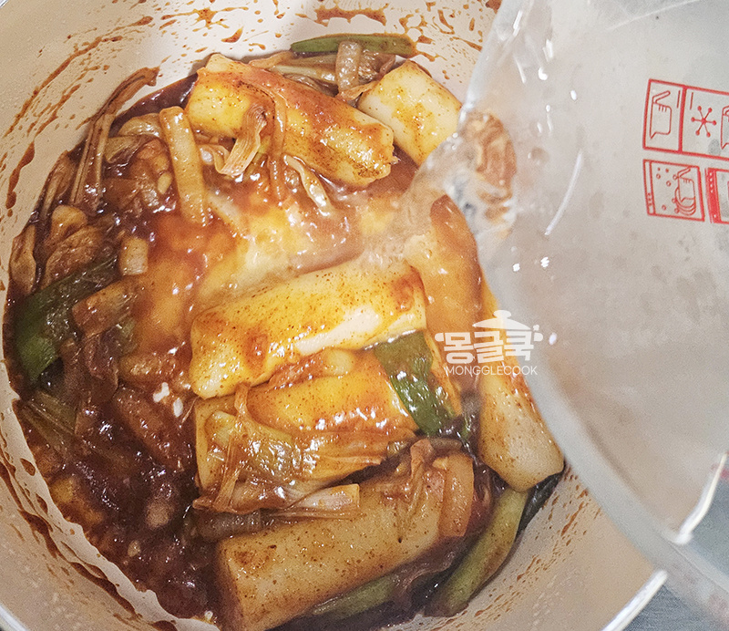 불을 약불로 줄인 뒤, 미리 만들어둔 양념장을 넣고 떡과 함께 고루 섞어주세요.