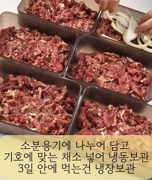 - 소분할때 통에 고기가 얇게 깔리게 펼쳐 넣어주셔야 해동할때 금방 녹아요.