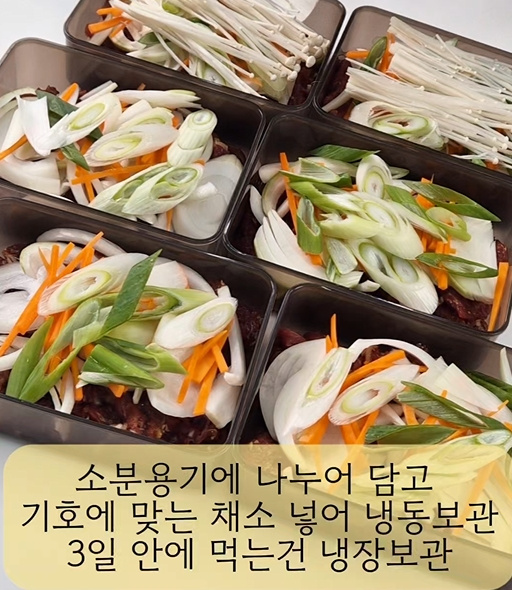 6등분으로 소분하여 담고 기호에 따라 양파, 대파, 당근, 팽이버섯을 올려 냉동보관 해요.