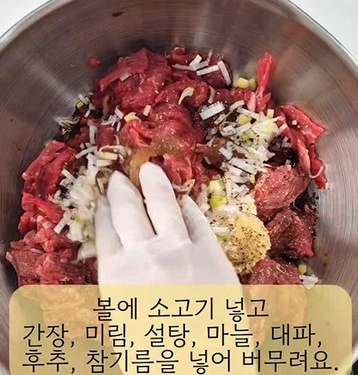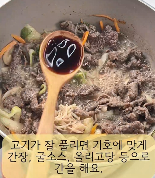 고기가 풀어지고 고기가 익으면 간을 본 후 기호에 맞게 굴소스, 간장, 올리고당을 추가해 간을 해 완성해요.