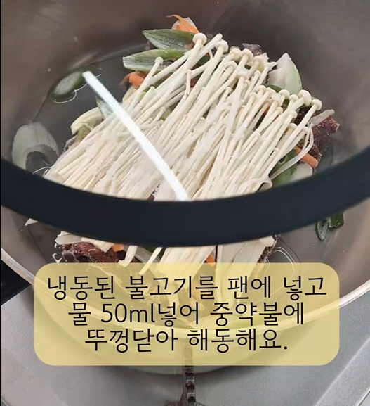 냉동 보관 후 꺼내어 팬에 넣고 물 50ml 넣어 중약불에 뚜껑을 닫아 해동하며 익혀요.