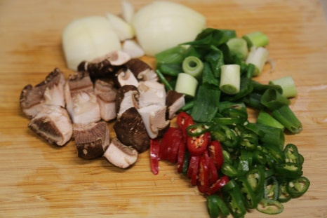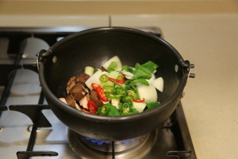 식용유 3스푼, 양파 1개, 대파 1대, 청양고추 2개, 홍고추 1개, 표고버섯 2개