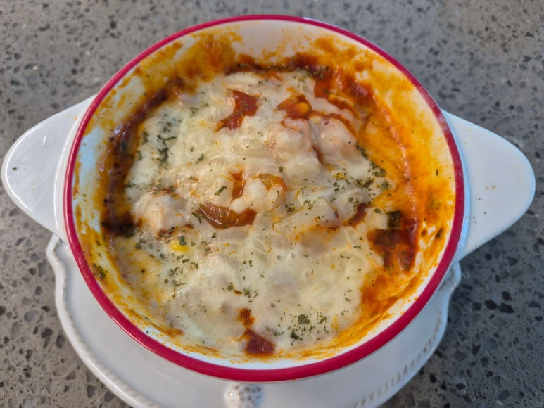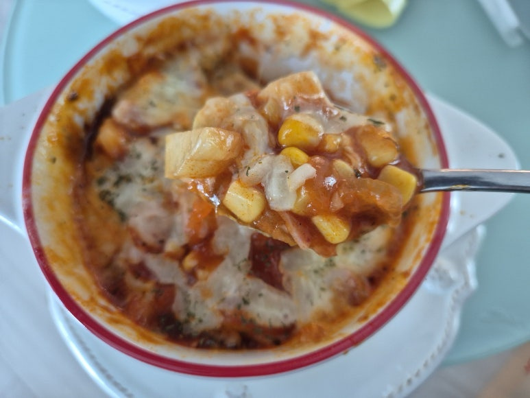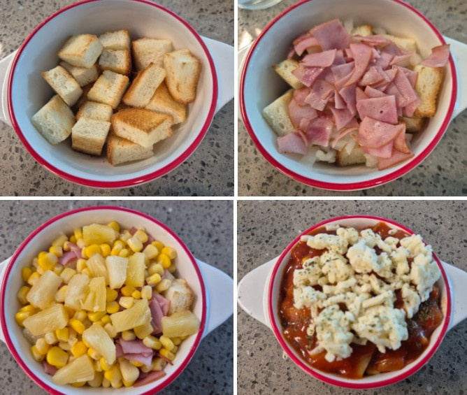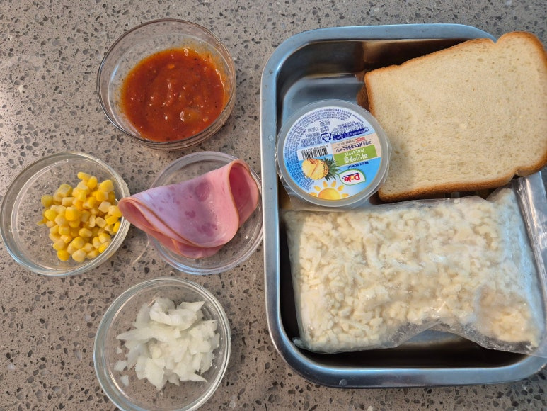 커다란 머그컵이나 수프 잔을 준비해서 구워 놓은 식빵을 먼저 넣어놓고 볶아 놓은 양파와 햄 그리고 옥수수까지 넣어요 파인애플 통조림도 있으면 넣어주세요 이어서 토마토소스도 적당히 넣고 그 위에 모차렐라치즈를 뿌려 줍니다 마지막 파슬리가루도 넣고 토핑을 마무리해요 저는 냉동실에 있는 치즈를 넣어 뭉쳐졌지만 조리하면 같아집니다