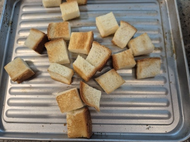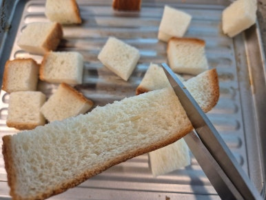 식빵 1장을 가위로 주사위 모양으로 자릅니다 자른 식빵을 토스트기나 에어프라이어에 넣고 2~3분 정도만 구워놓아요 살짝만 구워서 넣으면 눅눅해지지 않아서 좋아요