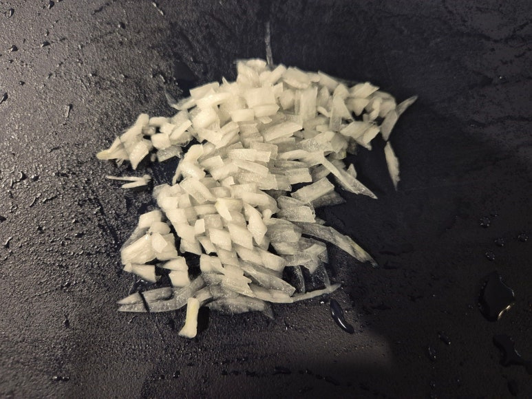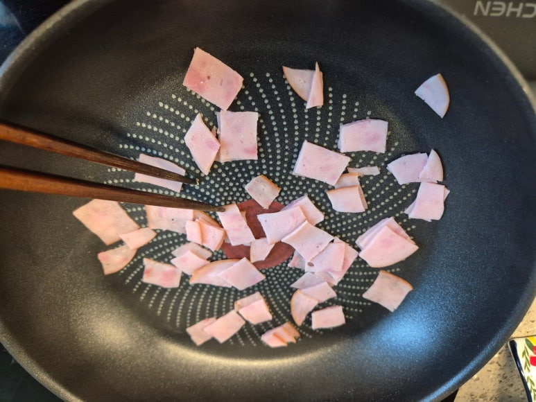 양파는 다지듯 썰고 햄도 사각으로 썰어 주세요