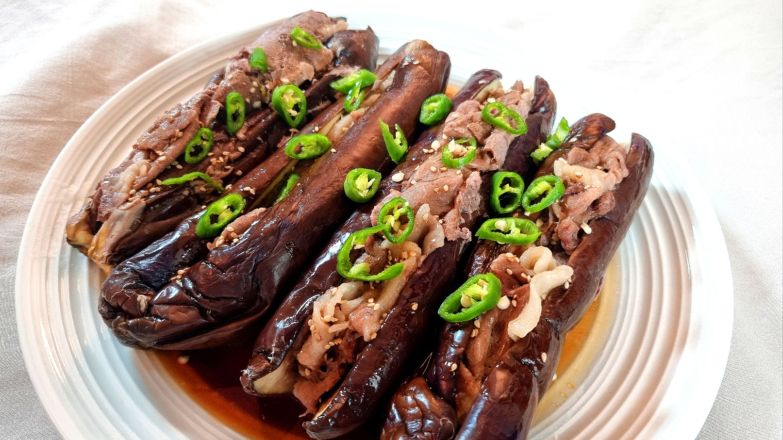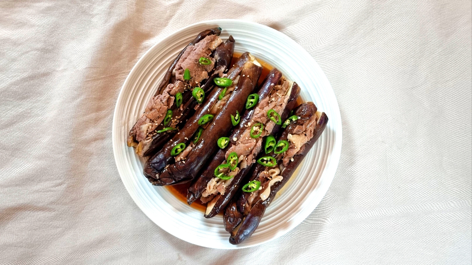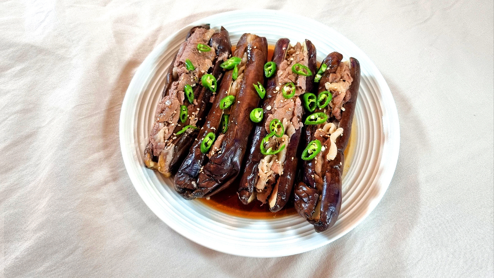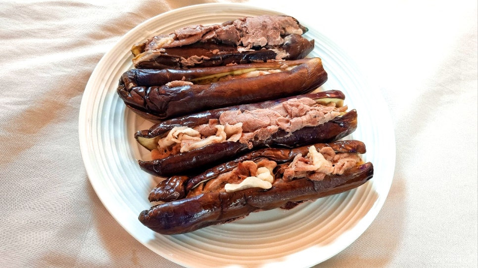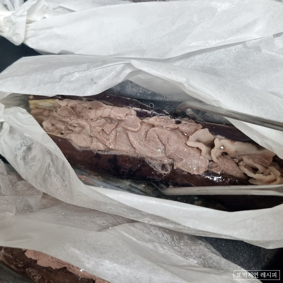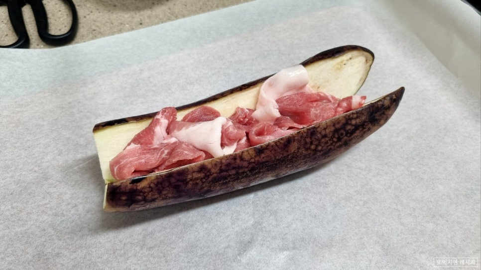 그다음 가지 속에 돼지고기를 적당히 넣어주세요.