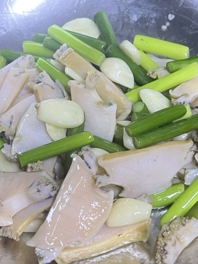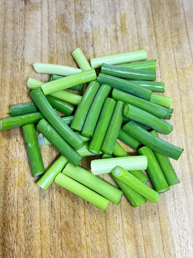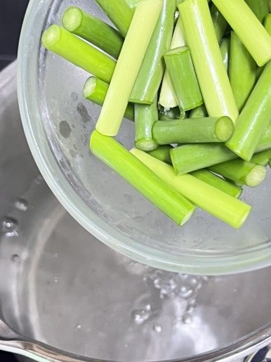 쫑은 먹기 좋은 길이로 자르고, 소금물에 살짝 2~3분 정도 데쳐 사용합니다. 끓인 물에 데쳐 손질해도 됩니다.