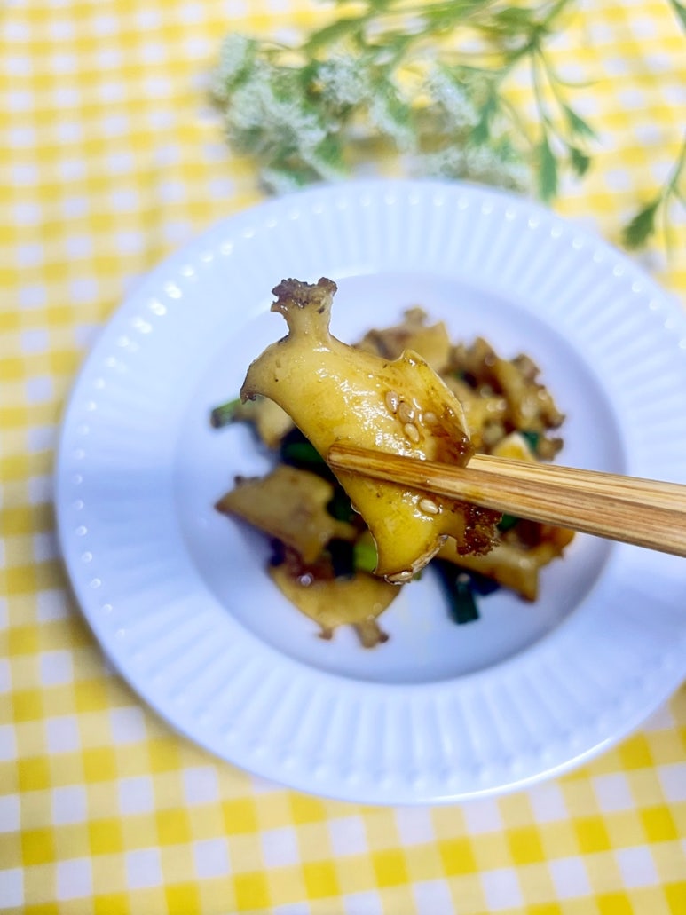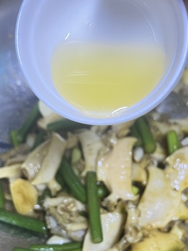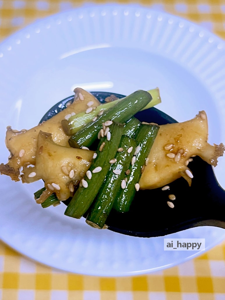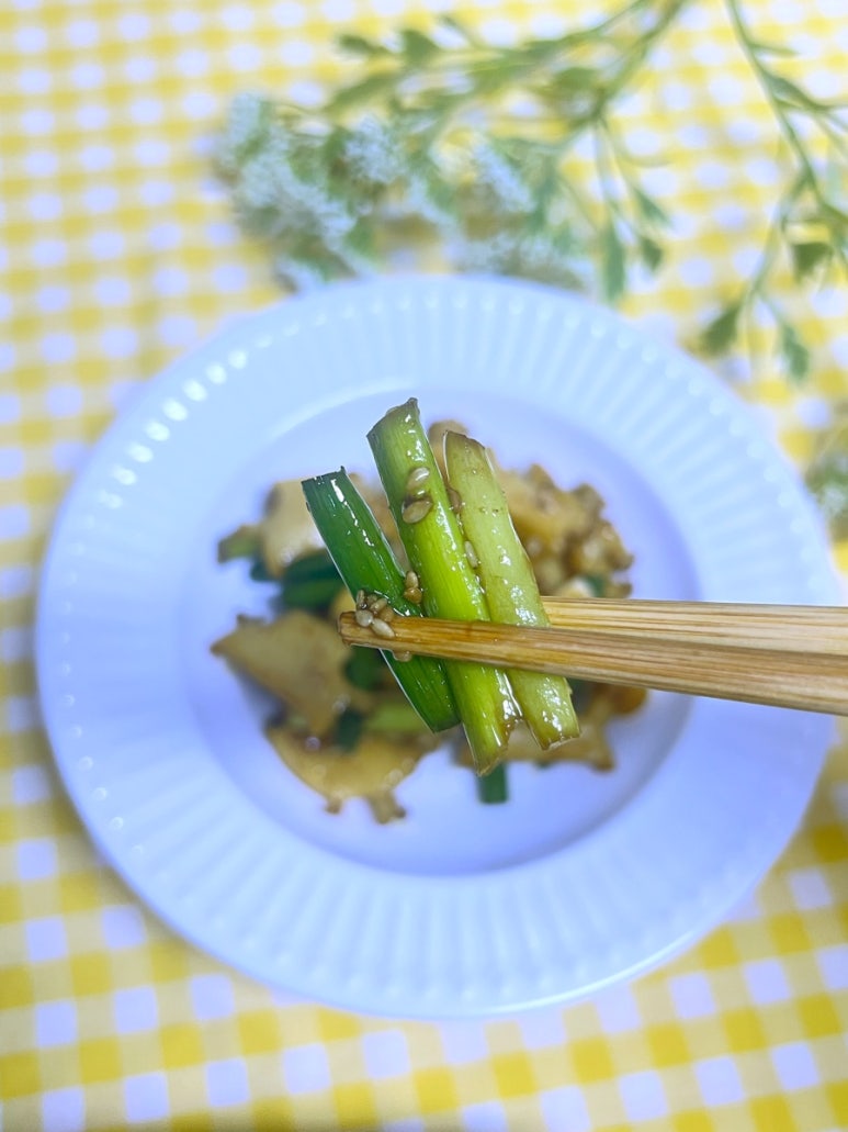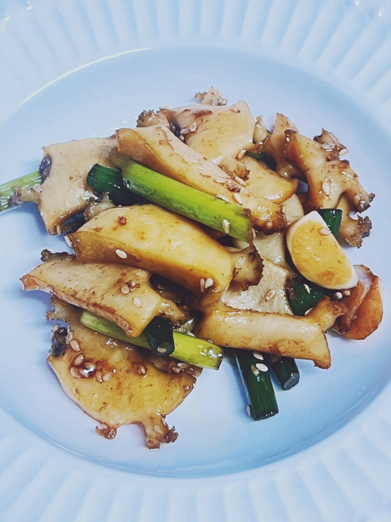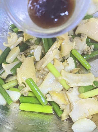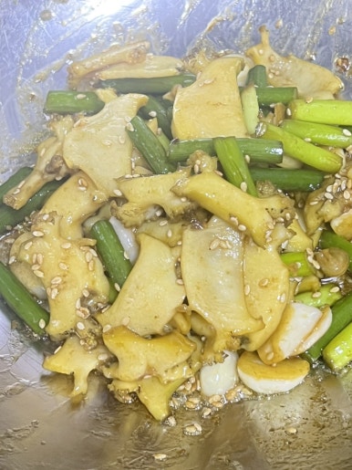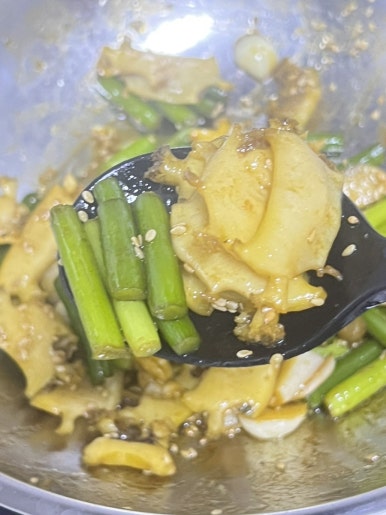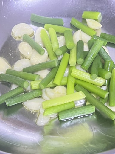 기름을 넉넉하게 두르고 슬라이스 마늘을 먼저 볶아주세요. 은은한 향이 기름에 가득입니다. 기후 데친 종도 추가해 주세요. 기름에 코팅된 그대로 먹어도 맛이 좋아요.