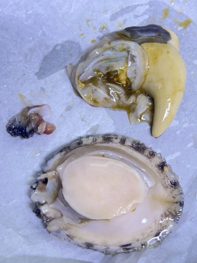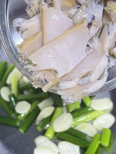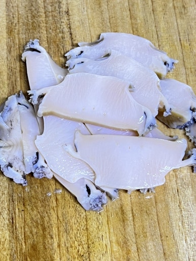 분리 후 내장과 입 (이빨 ) 부분을 제거해 주세요. 그리고 얇게 슬라이스합니다. 내장은 죽을 만들 때 사용해 보세요. 녹진한 죽을 만드는 데 꼭 필요합니다.