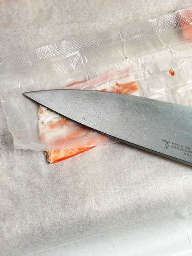 세로로 길게 3등분 합니다. 비닐은 버리지 말고 잠시 대기해 주세요.