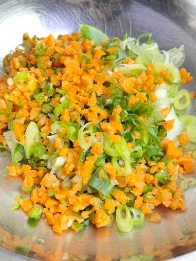 부침 요리에 빠질 수 없는 당근과 대파 느끼함을 잡아줄 청양고추를 다져 섞어주세요. 다지기를 이용하면 편리해요.