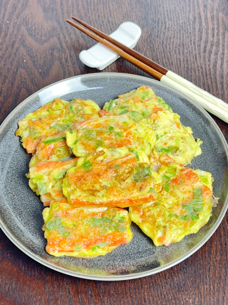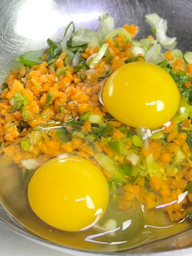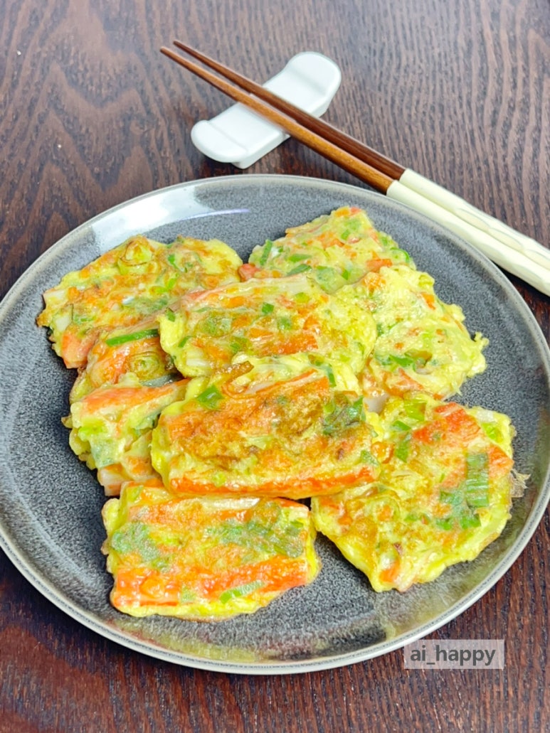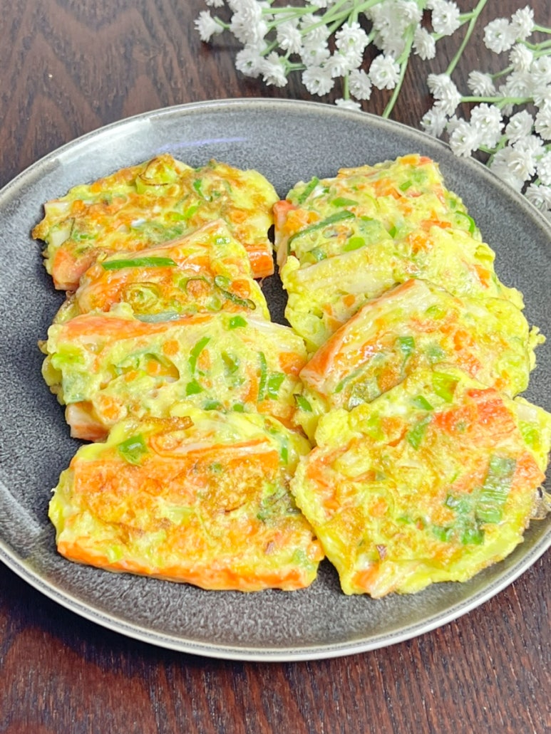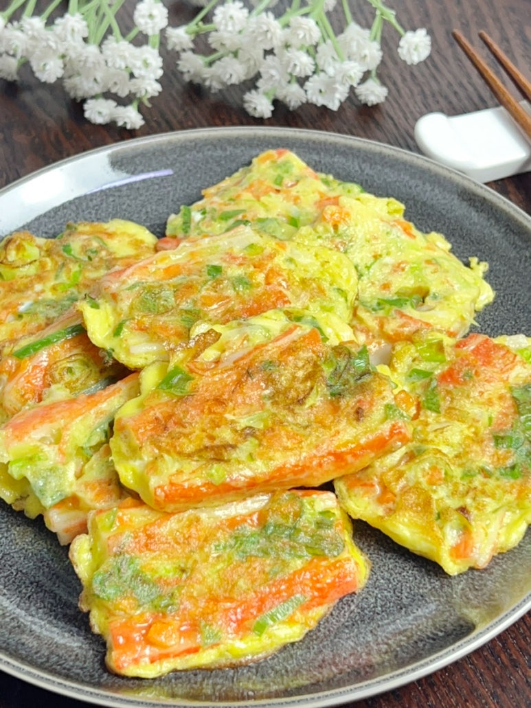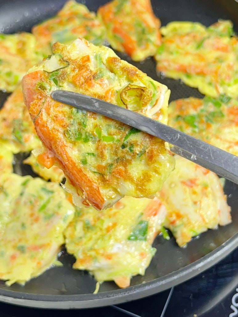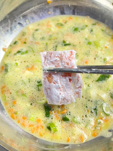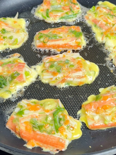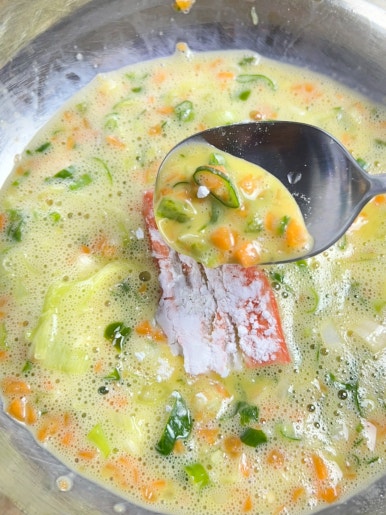 계란물에 부침가루 묻힌 크래미를 충분히 담가 주세요. 숟가락을 이용해 야채들이 골고루 묻을 수 있도록 합니다.