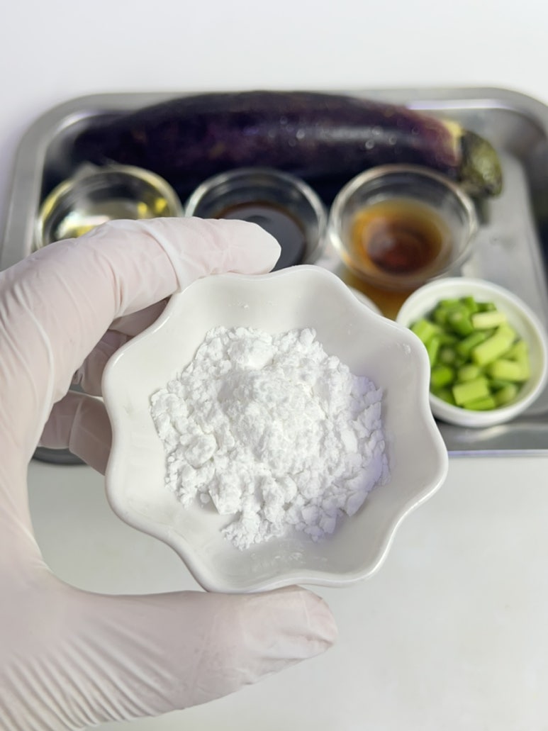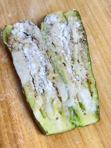반으로 자른후 포크를 이용해 속을 넓게 펼쳐 줍니다, 전분가루를 앞, 뒤 골고루 뿌려 주세요. 체를 이용하면 얇게 입힐 수 있어요.