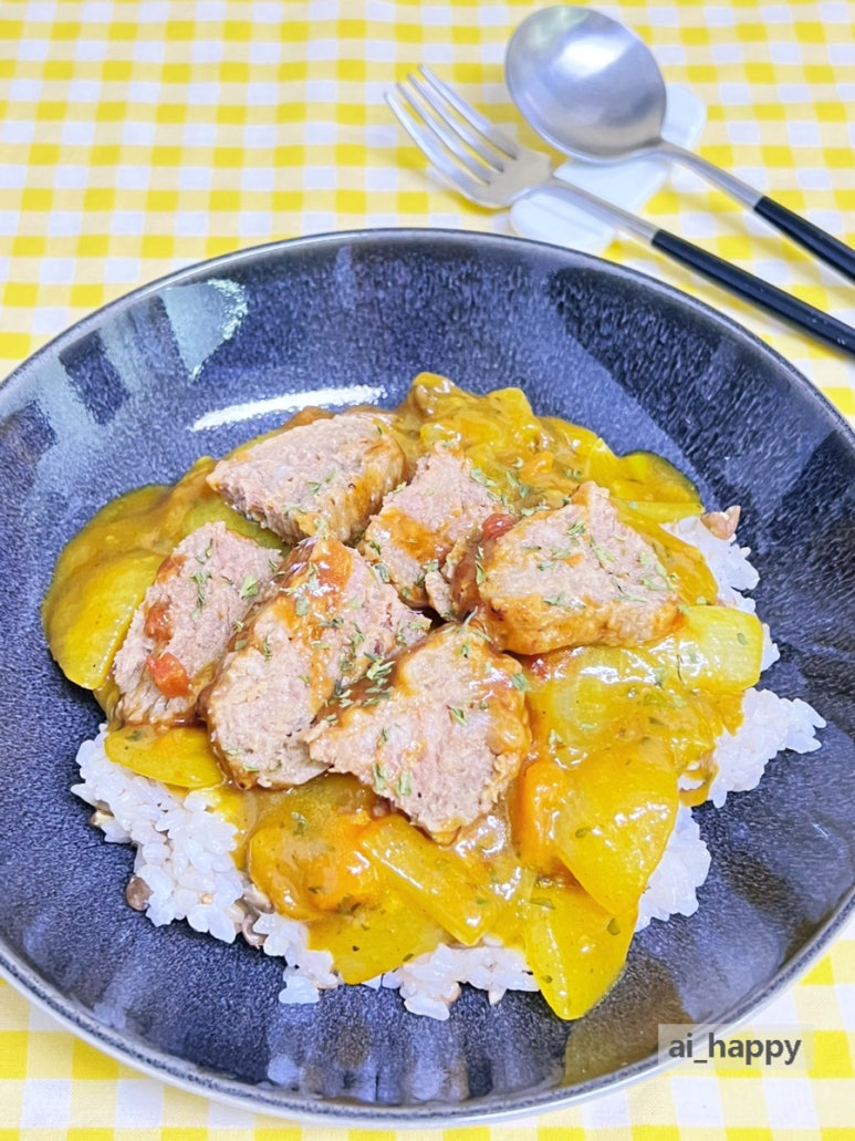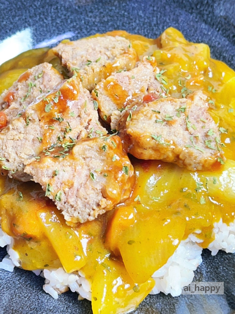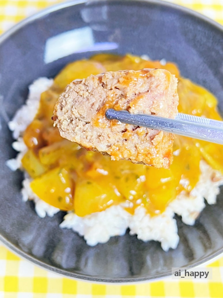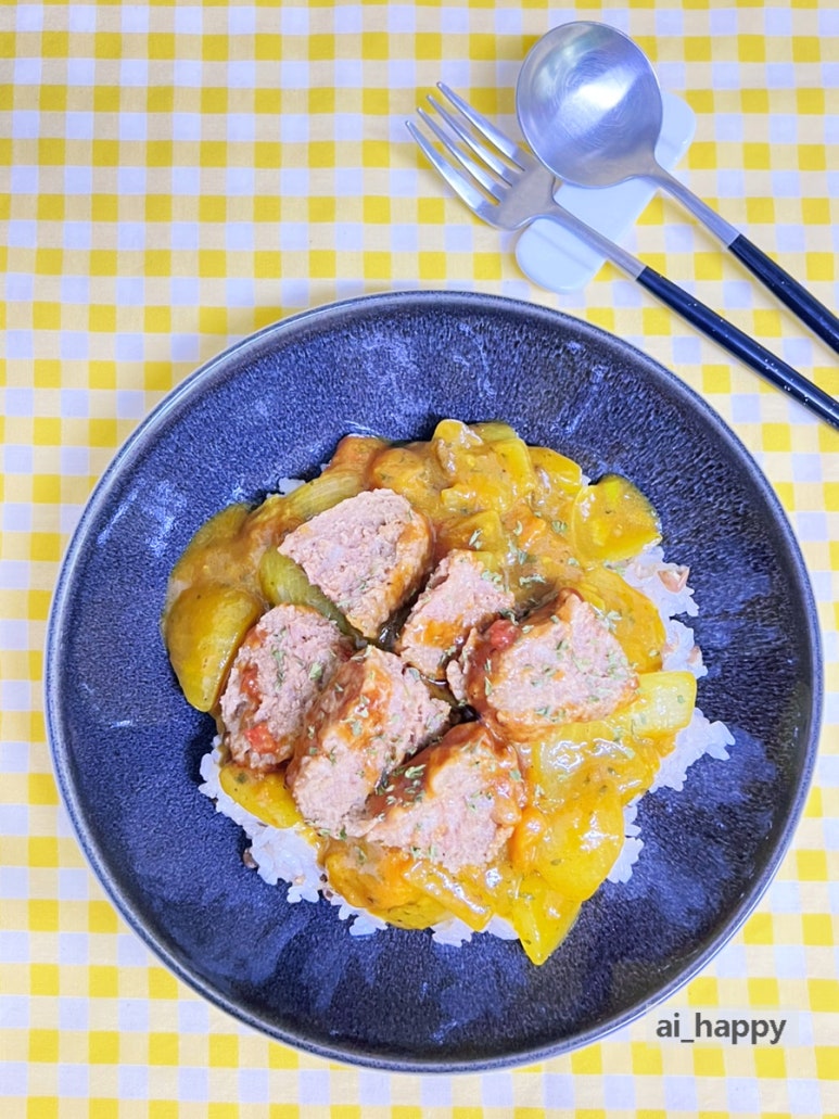 즉석카레를 활용하고 볶은 양파와 햄박스테이크를 올려 근사하게 한 접시 뚝딱 만들었어요.