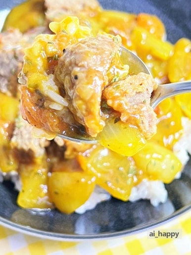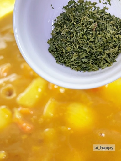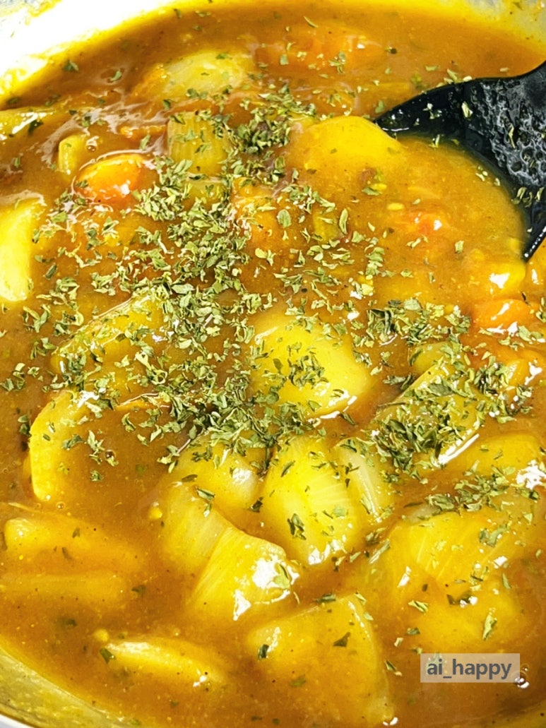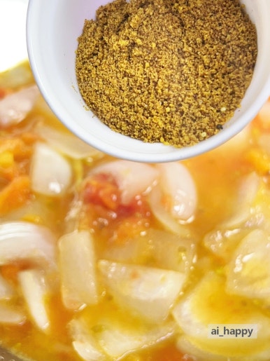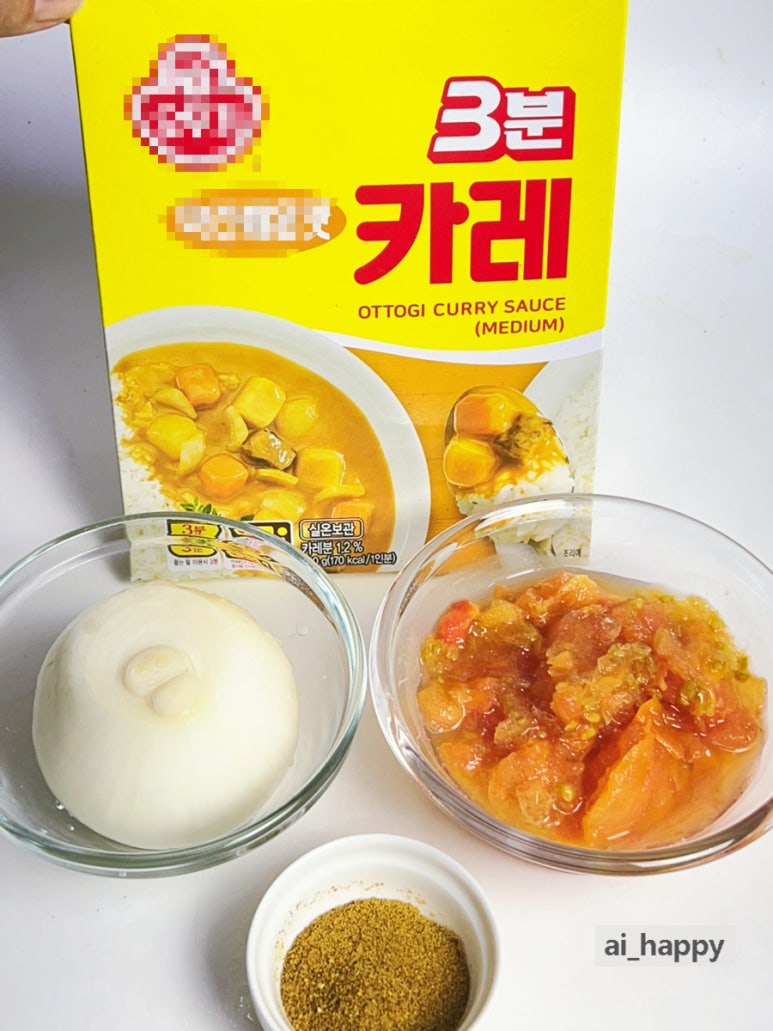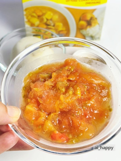3분 카레에 토마토를 넣어 수분 함량이 많아졌어요. 그래서 가루 카레 1T를 추가해 간을 맞추었어요. 초록 야채를 넣으면 영양상으로도 좋고 더욱 먹음직스럽지만 파슬리 가루만 추가해도 충분합니다.