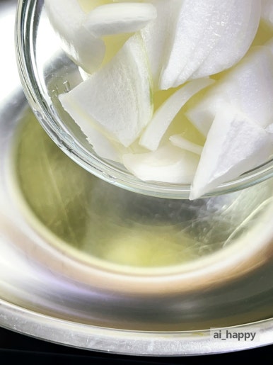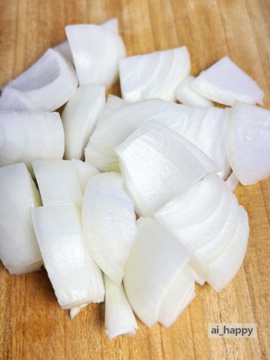 싱싱한 채소는 기본입니다. 양파는 크게 썰어 준비했어요. 팬에 기름 두르고 기름에 먼저 볶아 주세요.