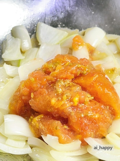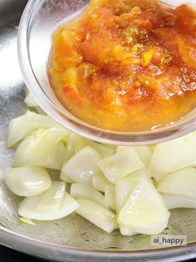 토마토는 다져 넣어줍니다. 냉동실에 얼린 것이 있다면 사용해도 됩니다. 퓌레를 이용해도 좋겠지요?