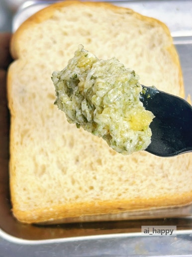 빵 위에 섞은 재료들을 골고루 펼쳐 주세요. 뭉치지 않게 넓게 넓게 펴줍니다. 발림이 좋아 쉽게 준비할 수 있어요.