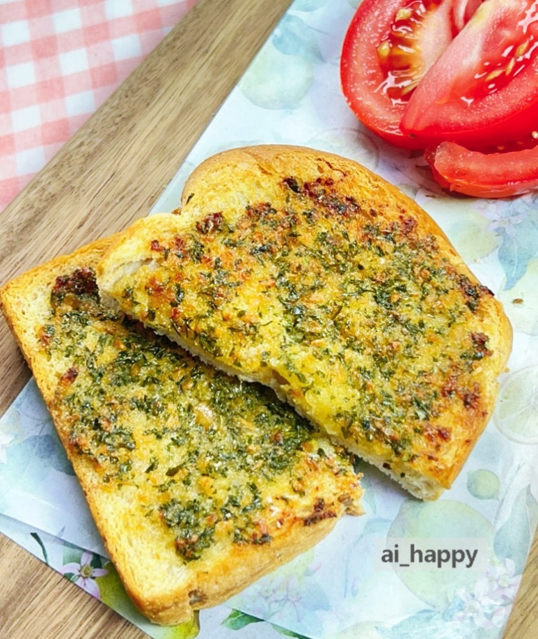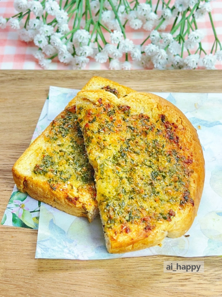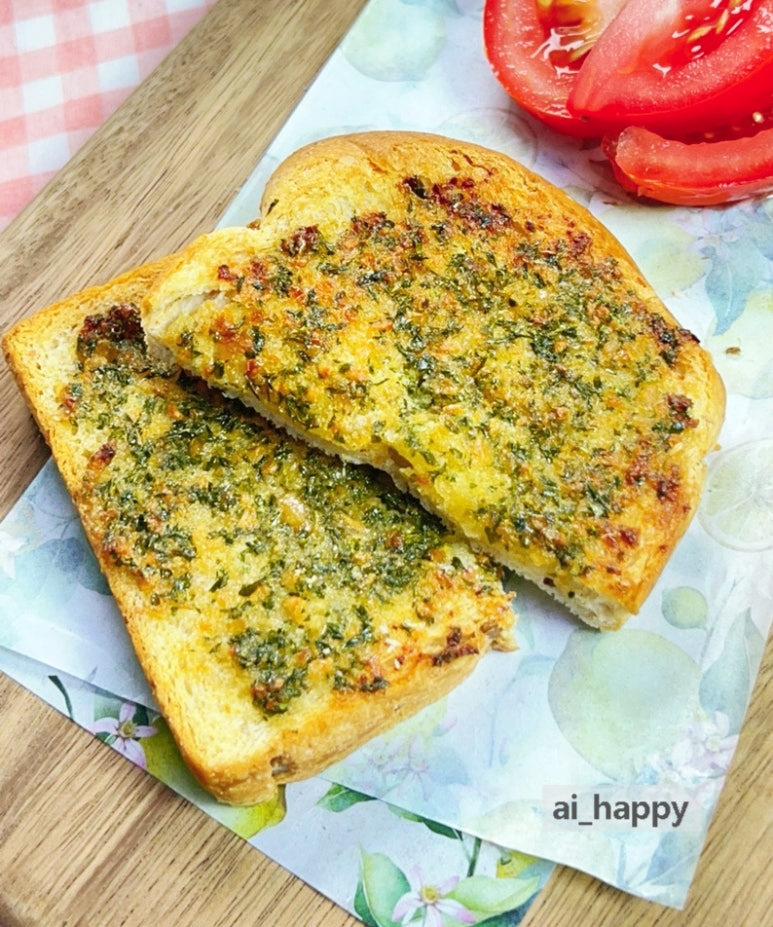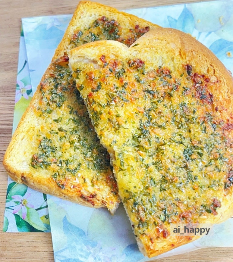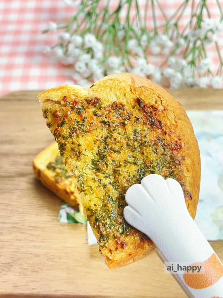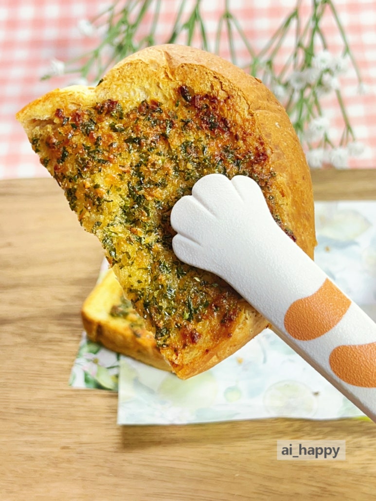 그래서 만들어 보았습니다. 촉촉할 때 얼려 두었던 식빵을 이용한 겉바속쫀 마늘빵이요. 버터의 고소함과 알싸하게 매운맛이 참 매력적이예요.