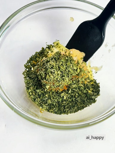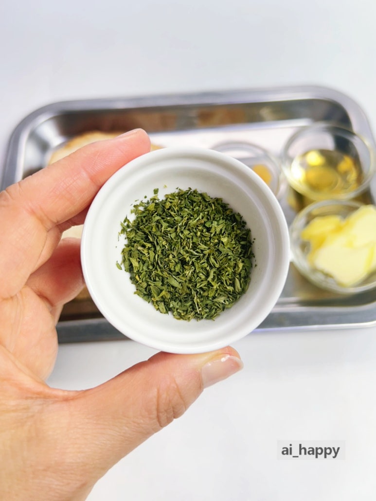 녹인 버터에 마늘, 알룰로스나 꿀, 파슬리를 충분히 넣어 섞어주세요. 설탕 대신 알루로스를 넣으면 칼로리 걱정을 줄일 수 있어요.