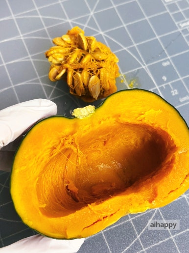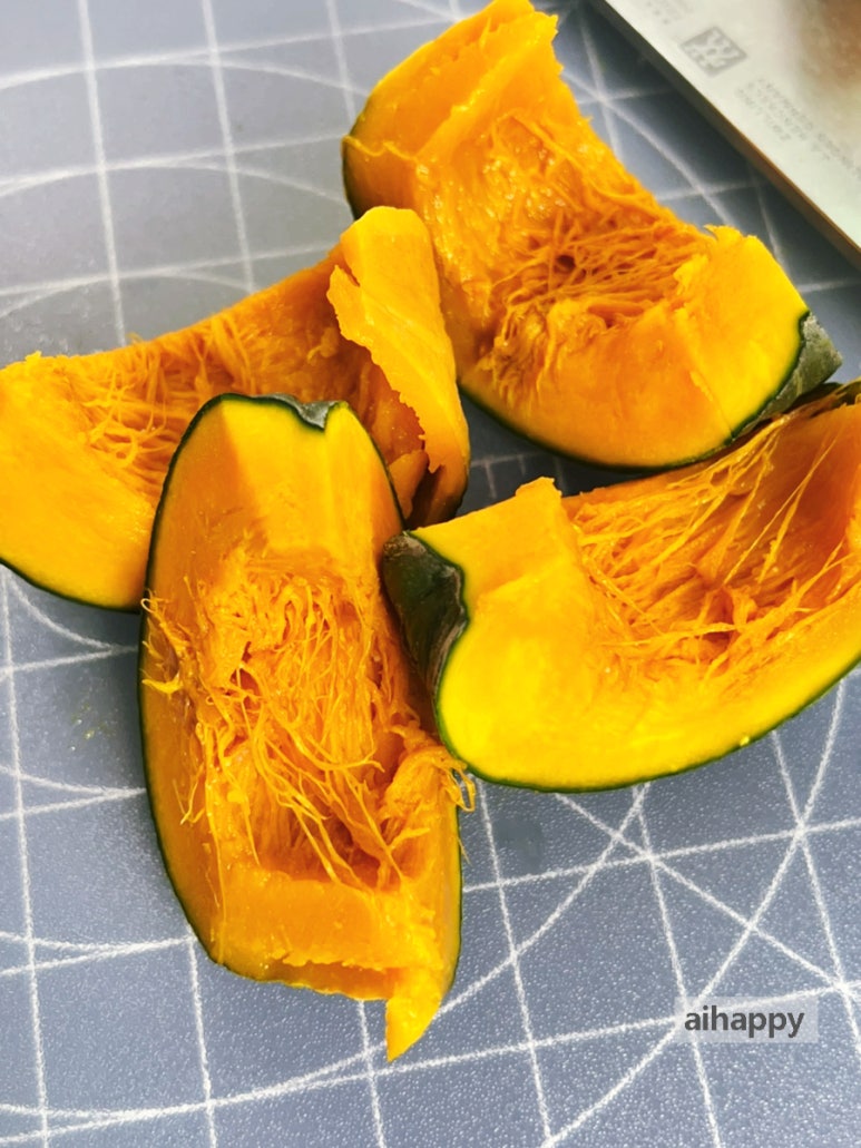 적당히 익은 호박은 숟가락을 이용해 씨를 제거합니다. 칼을 이용해 꼭지도 다듬어 주고 듬성듬성 잘라 주세요.