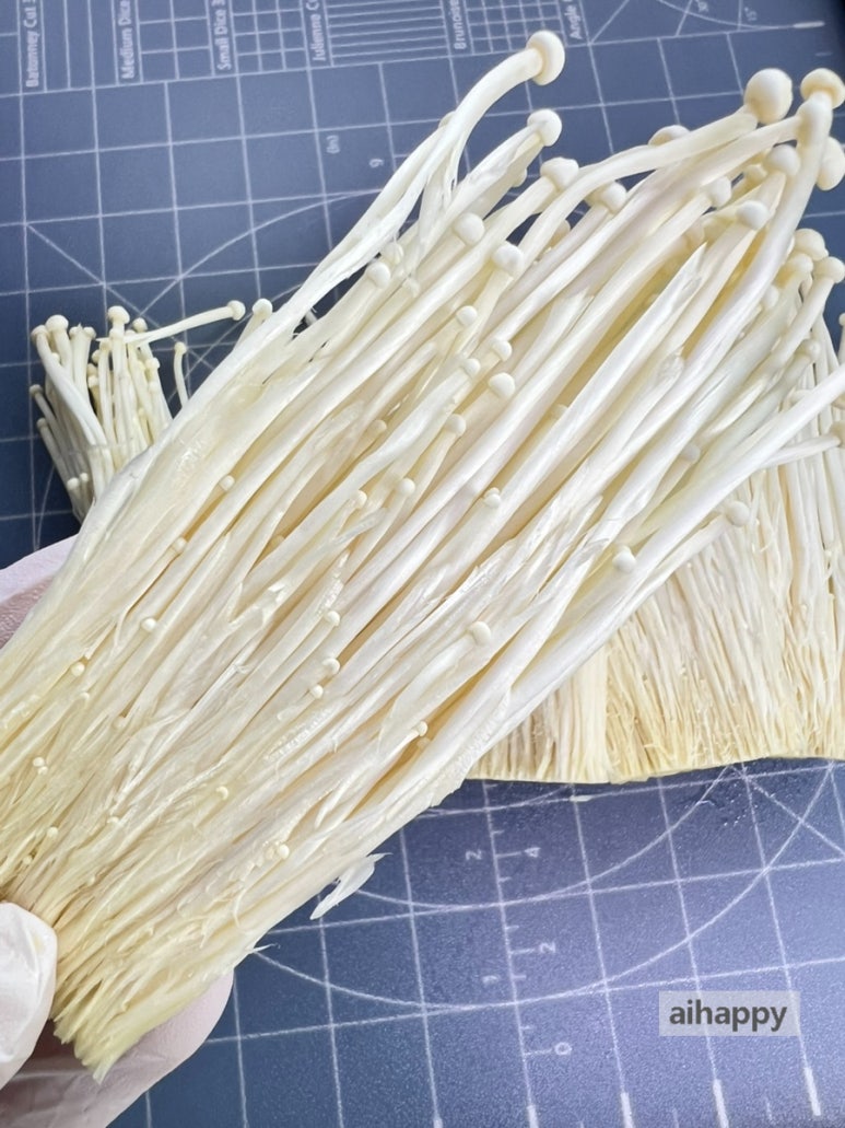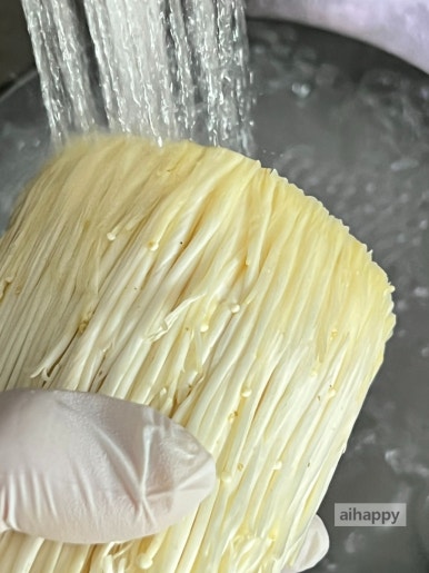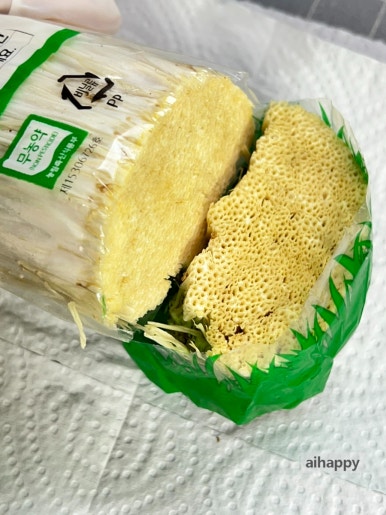 봉지째 밑동을 잘라 주세요. 흙이나 이물질은 털어주고 물로 살짝 헹궈 주었어요. 흐트러 지지 않게 여유 있게 남겨주세요.