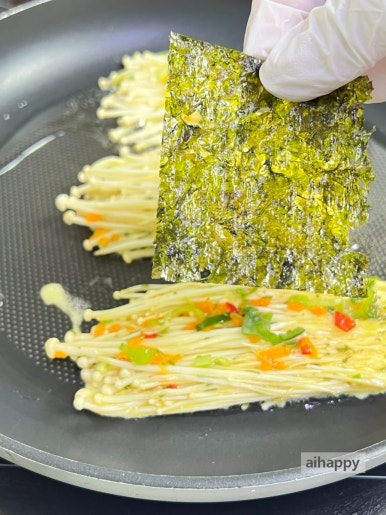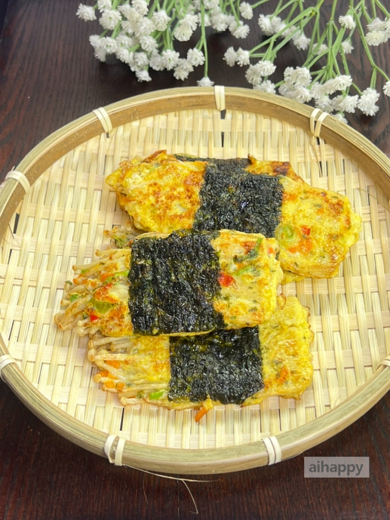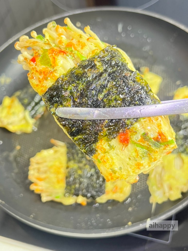 기름 넉넉하게 넣고 부쳐 주세요. 아랫면이 익어갈 때 김을 올려주세요. 향긋한 향을 추가할 수 있어요.