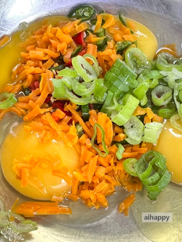 계란에 맛술을 넣고 소금을 살짝 추가했어요. 준비한 야채들을 넣어 골고루 섞어줍니다.