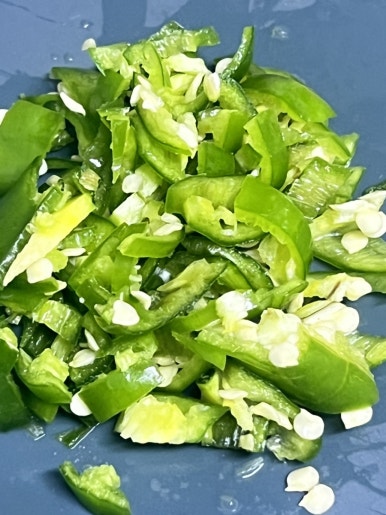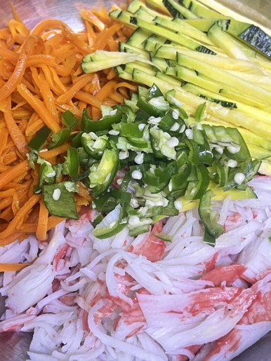 크래미는 비닐을 벗겨 결대로 찢어주세요. 당근은 얇게 채 썰어 줍니다.