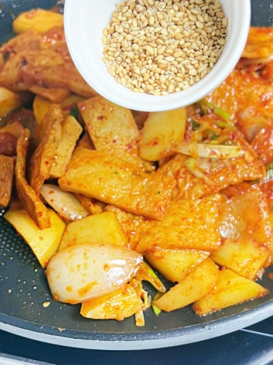 준비한 재료에 미리 만들어 놓았던 양념을 섞어주고 국물이 자작해질 때까지 재빠르게 익혀 주세요.