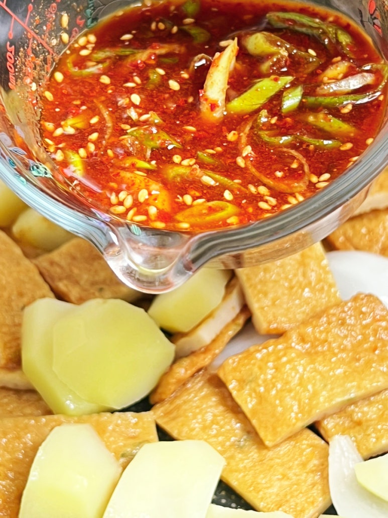 양파와 대파는 송송 썰어 준비해요. 간장, 고춧가루, 맛술, 물, 물엿, 간 마늘을 넣고 미리 섞어 사용합니다.