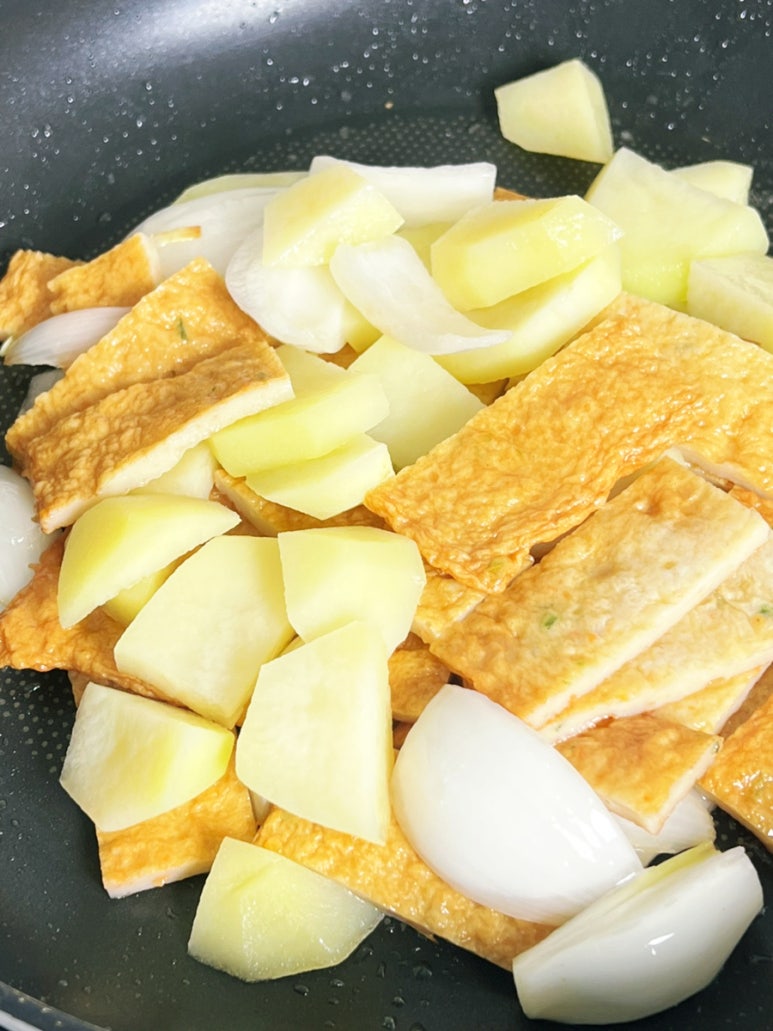사각 어묵을 사용했어요. 냉장고에 남아 있는 게 있다면 있는 재료 사용하세요. 양파는 큼직하게 썰어 주었어요.