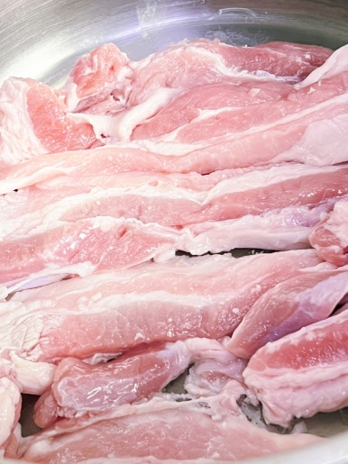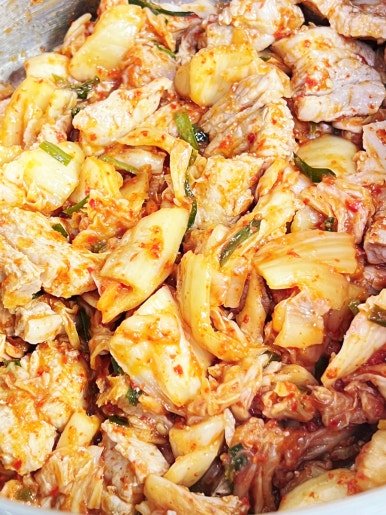먹기 좋게 잘라 고기와 함께 볶아주세요. 기름에 함께 볶으면 신맛을 사라지고 감칠맛의 베이스가 됩니다.
