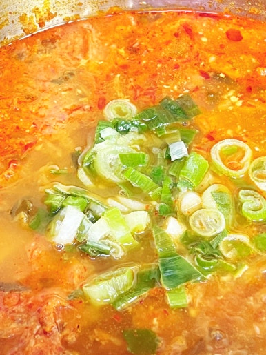 국물이 어느 정도 졸아지면 추가로 물을 넣고 충분히 더 끓여주세요. 적당한 농도가 되면 대파를 넣고 마무리합니다.