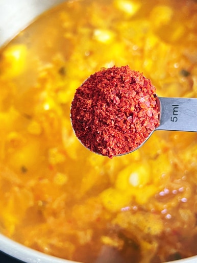 멸치육수, 코인 육수 등을 사용하셔도 좋아요. 칼칼한 맛과 맛있는 비주얼 담당 고춧가루도 추가해 주세요. 간 마늘은 충분히 많이 넣어도 됩니다.