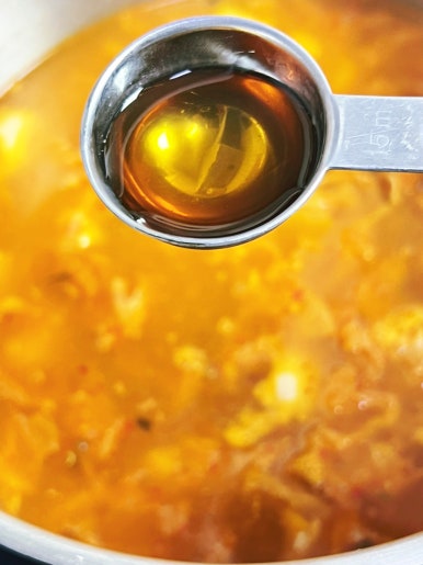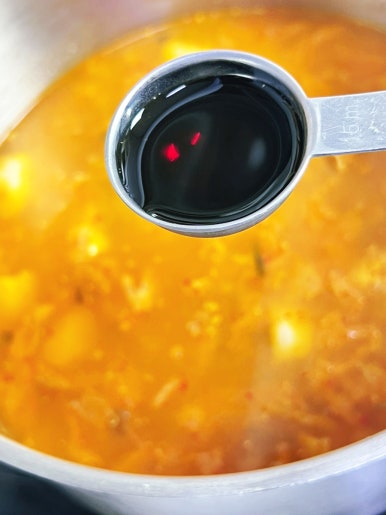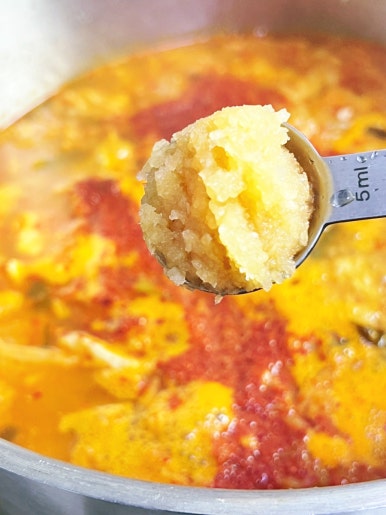 한 번에 물을 다 넣지 않고 2차로 나누어 물 조절을 해 주세요. 자기 박하게 끓이다 중간에 추가하며 맛과 물의 양을 맞춰 주시면 됩니다.