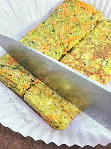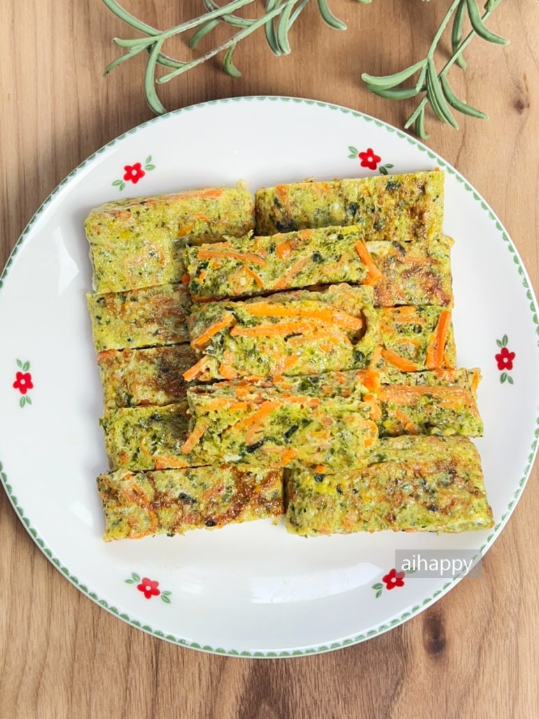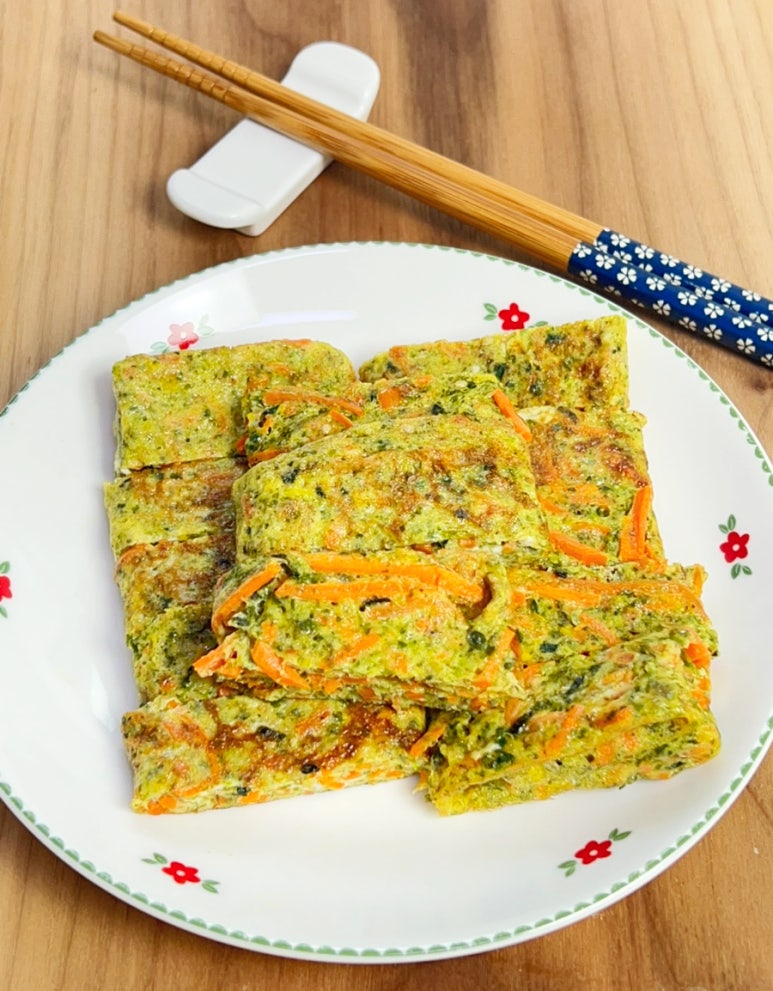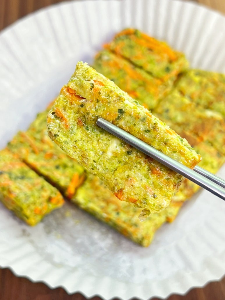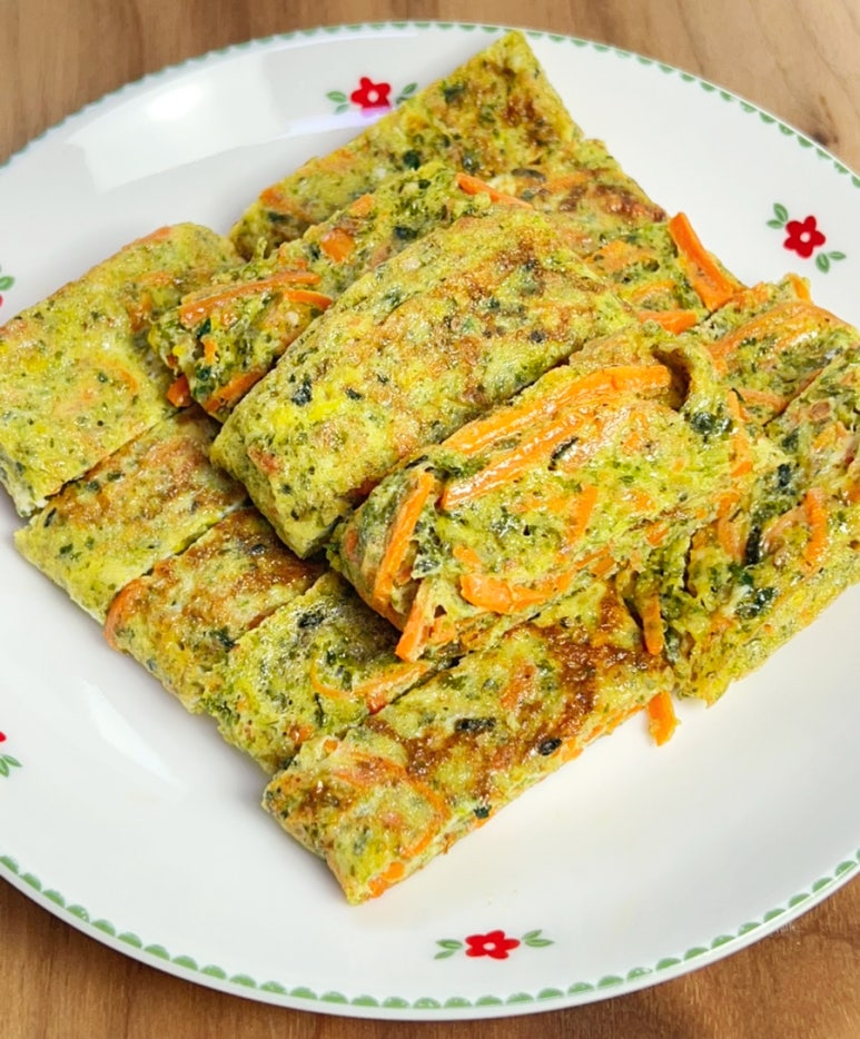사각 팬에 기름을 넉넉하게 두르고, 중불에 부쳐 주세요. 부드럽고 담백하게 만들 수 있지요. 당근을 많이 넣어 식감이 좋아요.